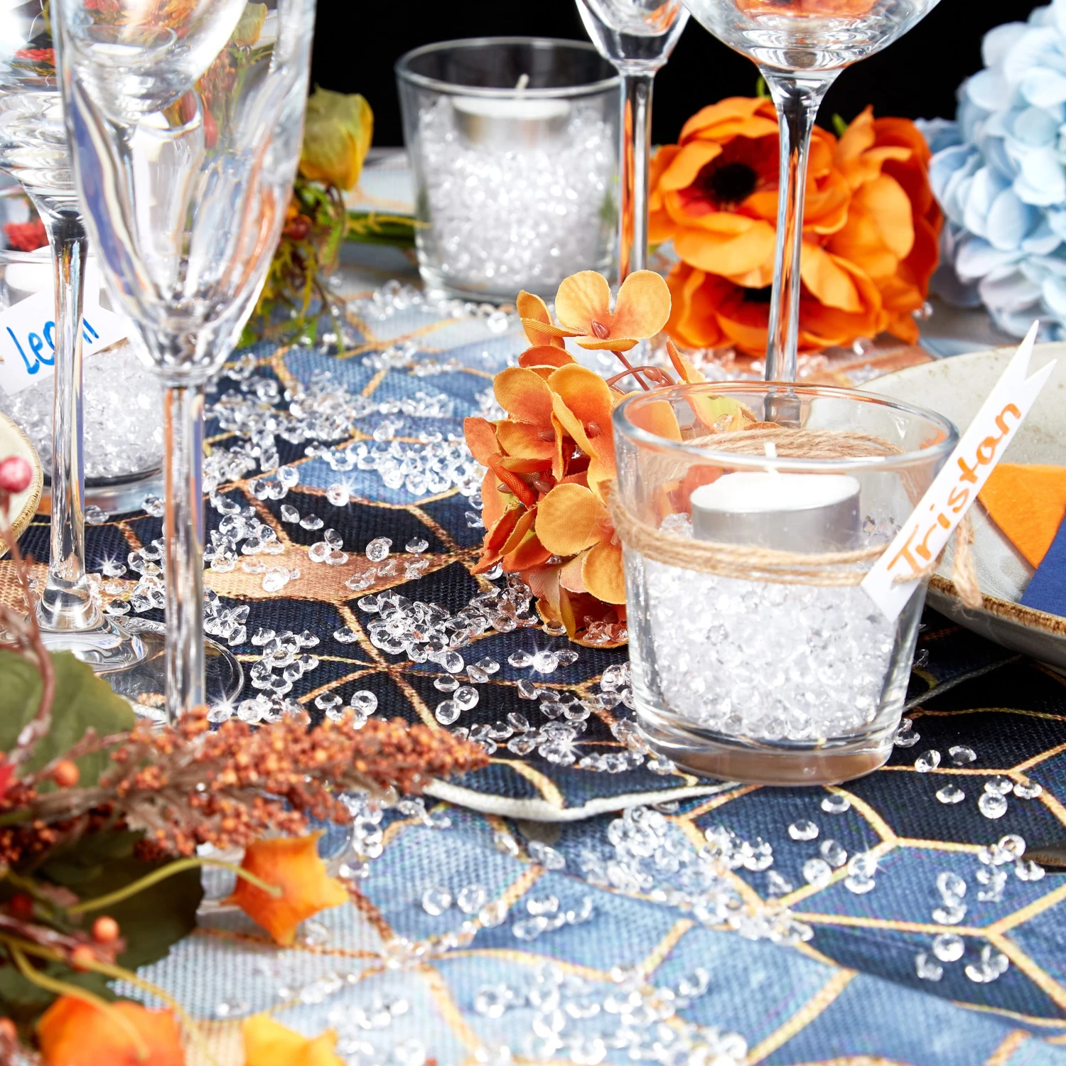 Sie suchen noch nach dem letzten Schliff, um die Tische auf Ihrer Hochzeitsfeier zu dekorieren? Dann sind Sie mit diesen funkelnden Dekosteinen genau richtig beraten. Auf der Festtafel verstreut sorgen die Schmucksteine für einen tollen Blickfang. Auch in Teelichtgläsern, Kerzenhaltern oder Vasen machen die Steinchen eine gute Figur. Wer ein ruhiges Händchen hat, kann die Strasssteine auch wunderbar zum Basteln verwenden oder damit Sträuße und Textilien verzieren.