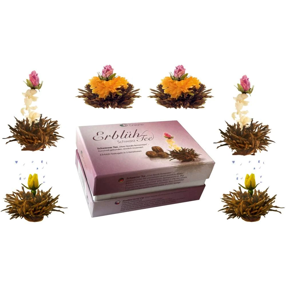 Der ErblühTee von Creano bietet dem Genießenden ein außergewöhnliches Erlebnis: Im Innern der Kugel befindet sich eine kunstvoll eingebundene exotische Blüte. Ihr Geheimnis entfaltet die Kugel aber erst, wenn sie in ein Gefäß mit kochend heißem Wasser gegeben wird. Sie beginnt sich langsam zu öffnen und bringt am Ende der Aufgussinszenierung die eingebettete Blüte hervor, die formenreich und farbenprächtig aus ihr emporsteigt.