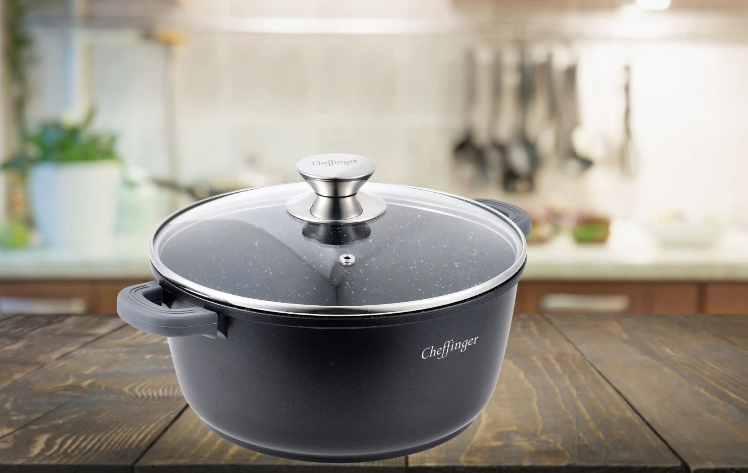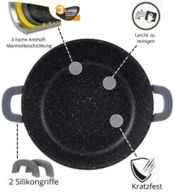 Es besteht aus Aluminiumguss und hat eine 3-schichtige Marmorbeschichtung und abnehmbare Silikongriffe. Es kann auf alle Arten von Wärmequellen verwendet werden und es kann auch im Ofen bis 240 Grad eingesetzt werden. Der mitgelieferte Deckel besteht aus gehärtetem Glas und es hat einen Edelstahlknopf