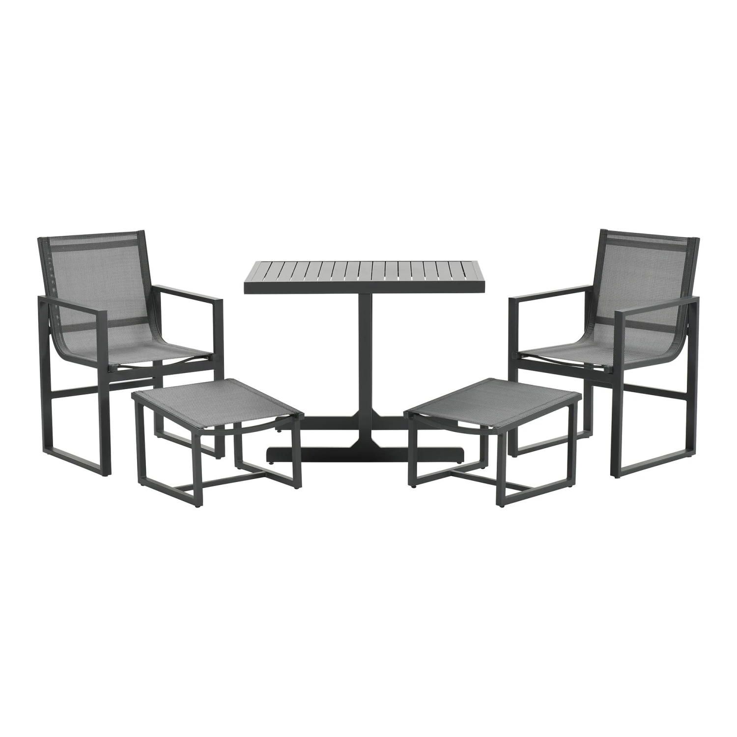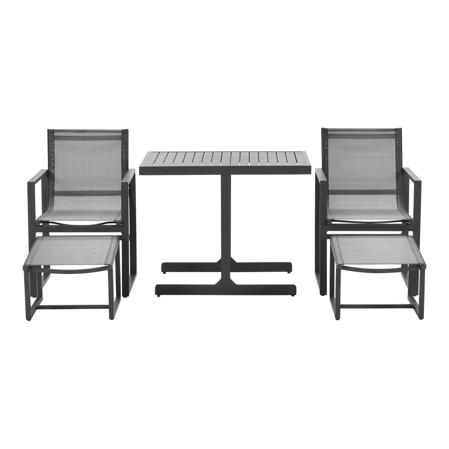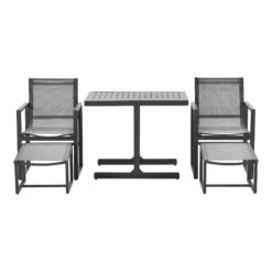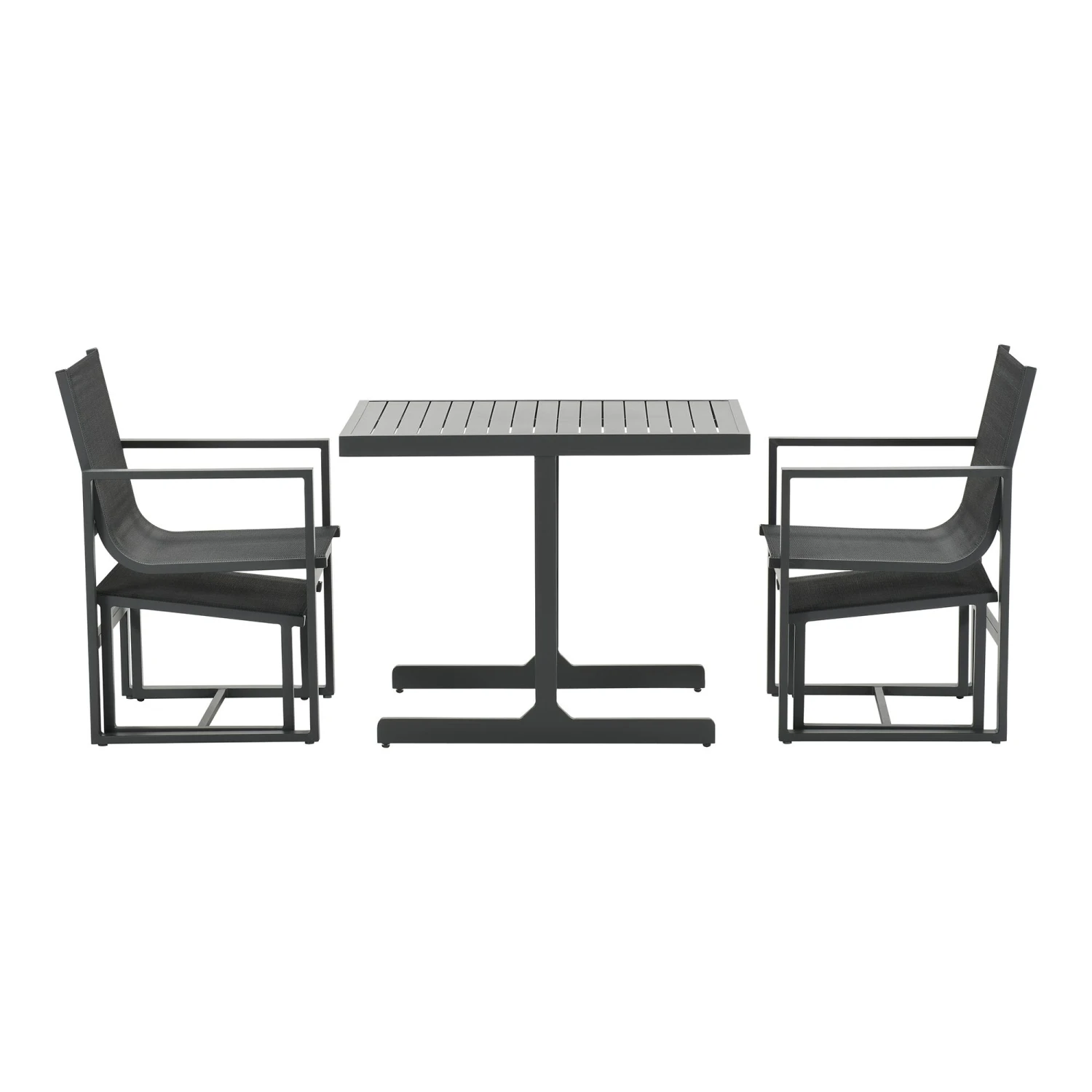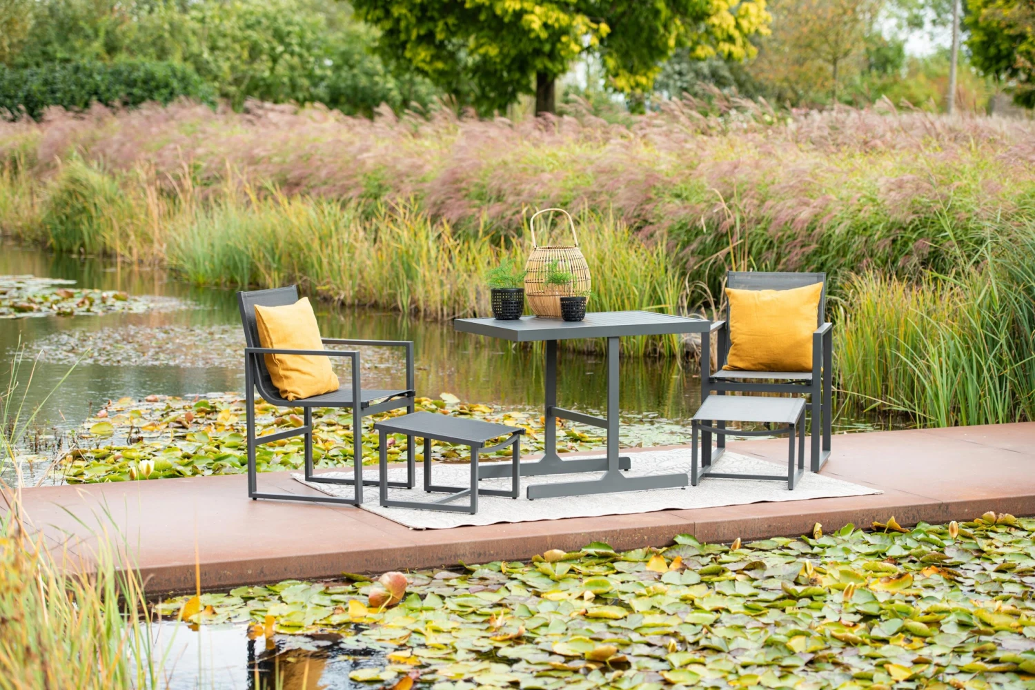 Das Aluminium Balkonset Alabama hat ein kompaktes Design und sorgt für viel Komfort. Das Set besteht aus einem Tisch, zwei Stühlen und zwei Fußbänken. Die Sitzgruppe ist so geschaffen, dass man sie komplett ineinander schieben kann, sodass es so wenig Platz wie möglich einnimmt, wenn es nicht benutzt wird oder eingelagert werden soll.