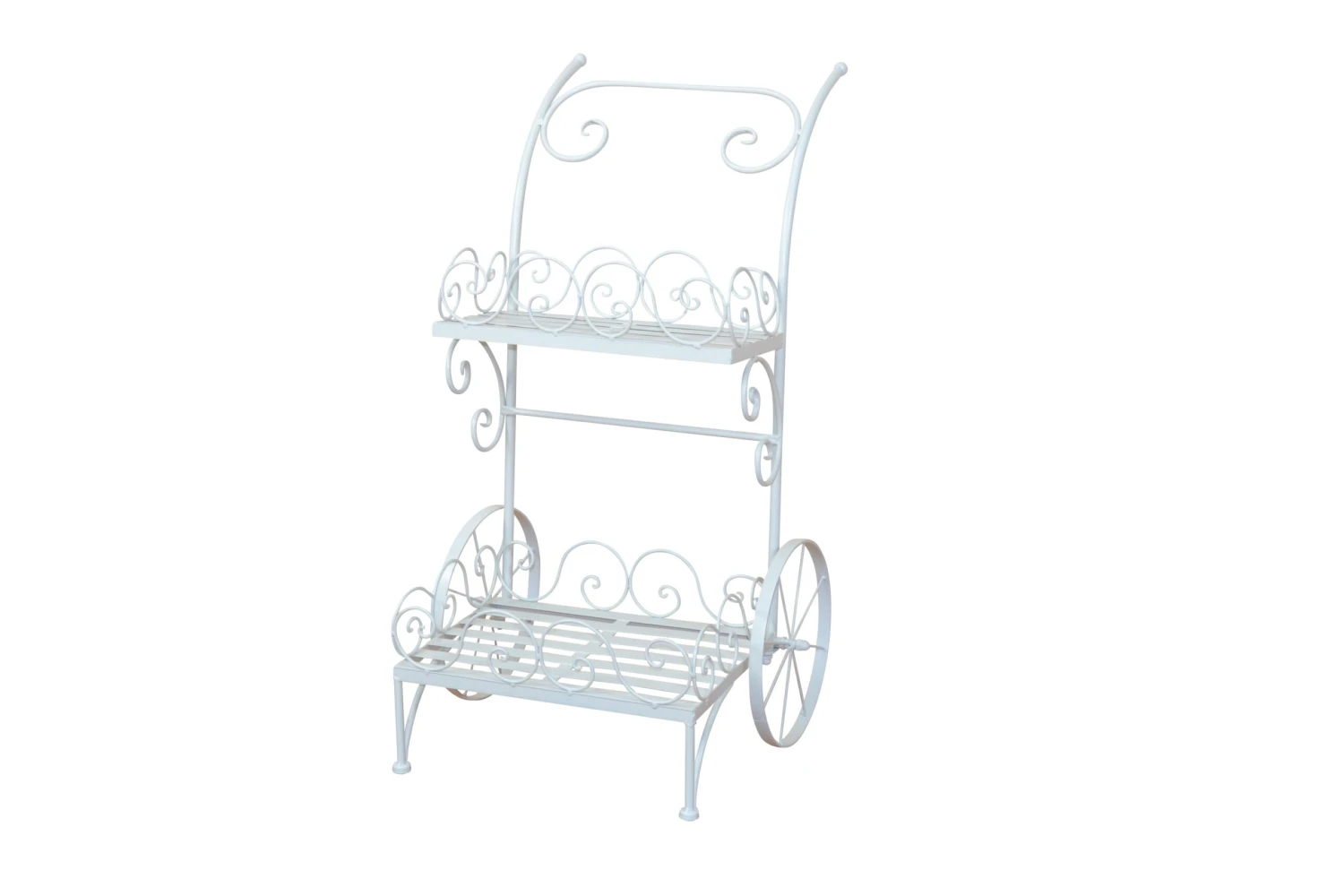 Funktioneller Blumenständer aus Metall mit einer pflegeleichten, pulverbeschichteten Oberfläche, cremeweiß, mit insgesamt 2 Gitterablagen mit schöner Verzierung. Mit 2 Deko-Metallrädern. Stellfläche der Gitterable unten ca. 23 cm tief, oben ca. 14,5 cm tief. Gesamtmaße ca. cm: B. 49 x T. 36 x H. 80 cm. Ohne Dekoration. Auch in schwarz lieferbar.