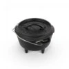 Der Deckel des Dutch Oven besitzt auf seiner Oberseite drei Standfüße, so dass Du ihn umgedreht auch als Warmhalteplatte oder Pfanne benutzen kannst. Auch auf der Oberseite befindet sich ein umlaufender Rand an der Seite, damit die auf dem Deckel platzierte Kohle beim Anheben nicht herunter rutschen kann. Für ein einfaches Handling ragt auf dem Deckel eine Öse hervor, an der Du ihn mit einem Deckelheber ganz bequem anheben kannst, ohne Dich zu verbrennen.