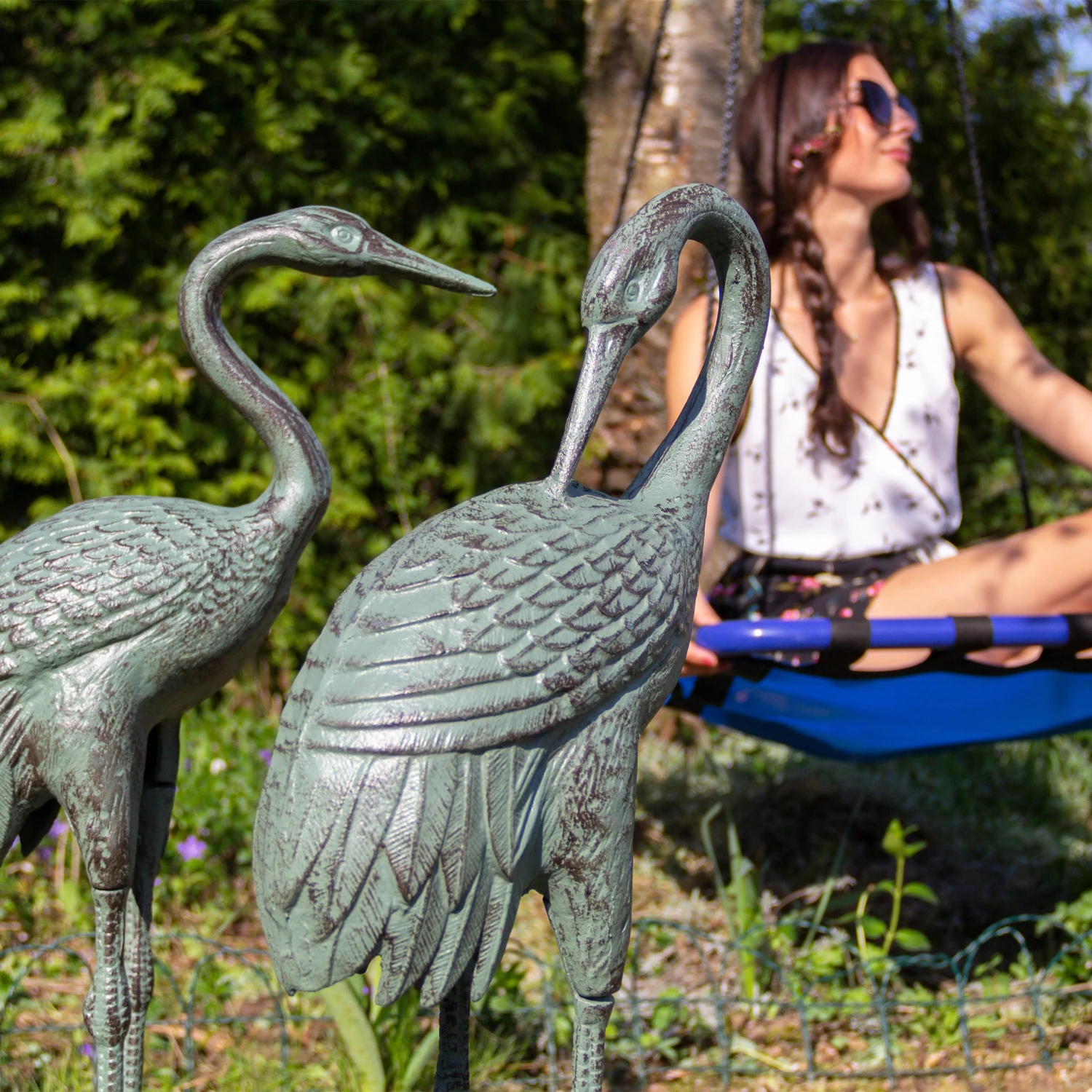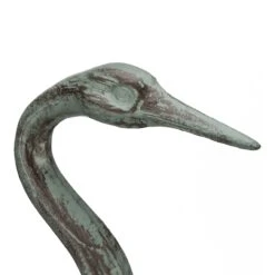 Der Kranich ist komplett aus Gusseisen gefertigt und kann ganzjährig Draußen aufgestellt bleiben, da er wetterfest und frostbeständig ist. Durch den runden Standfuß steht die Dekoskulptur stabil und muss nicht extra am Boden befestigt werden. Nach einiger Zeit im Freien verblasst die Farbe und verwandelt sich in einen wunderbaren Patina-Effekt.