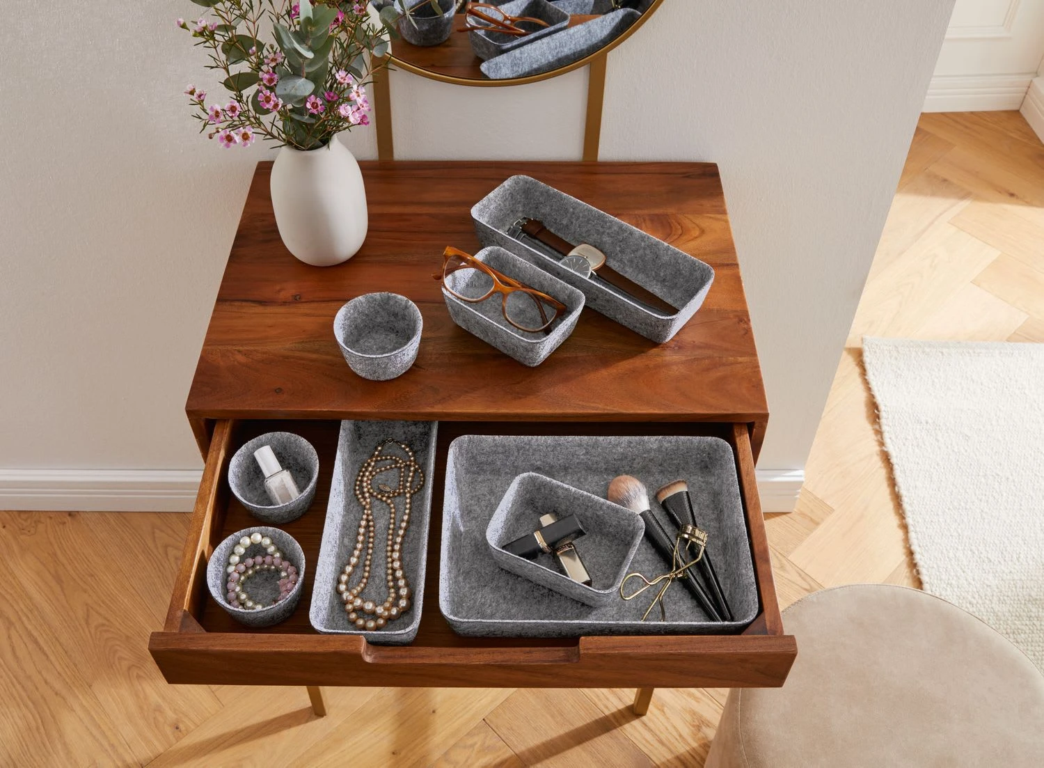 praktisches Set in trendigem Grau, 4 unterschiedliche Größen, ideal zum Aufbewahren, platzsparend ineinander stapelbar
