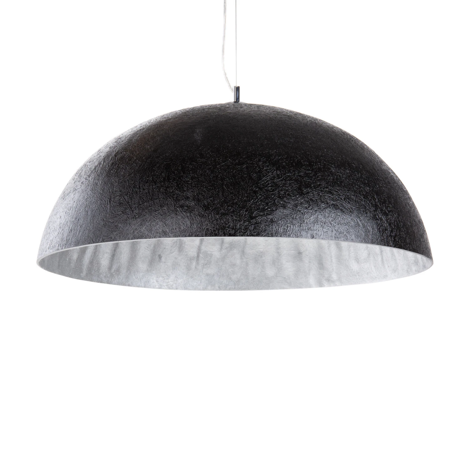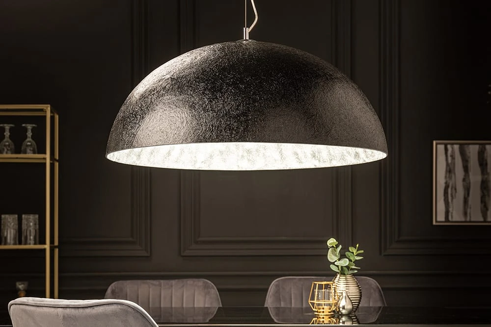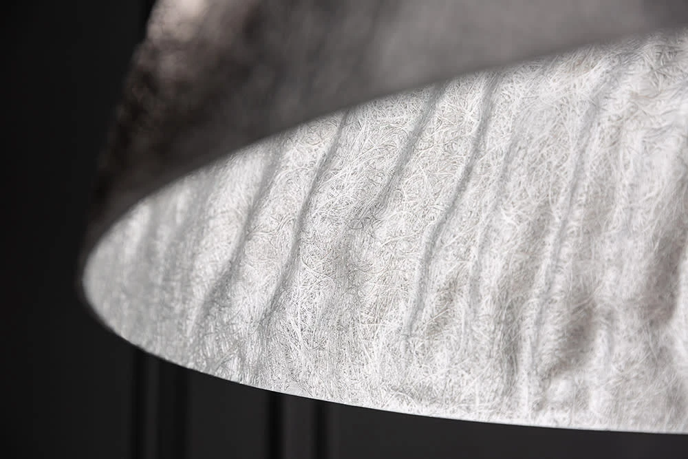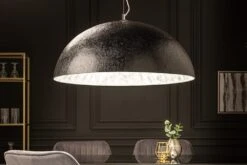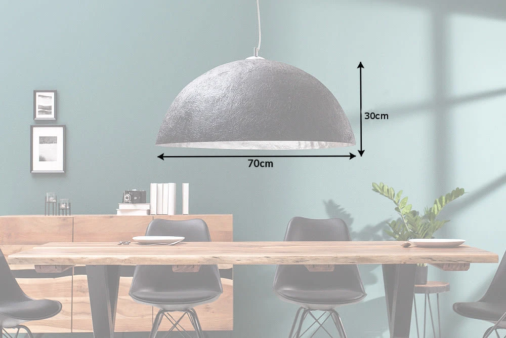 Verschaffen Sie Ihrem Esstisch oder Ihrem Wohnzimmer eine besonders warme und gemütliche Atmosphäre, mit der Design Hängeleuchte GLOW. Der große Schirm dieser prachtvollen Leuchte ist halbrund und aus Glasfaser und Fiberglasmaterial hergestellt und gibt durch den an der Innenseite in Antik Silber gestalteten Reflektor ein dem Sonnenlicht ähnlich gefärbtes Licht indirekt in den Raum ab.