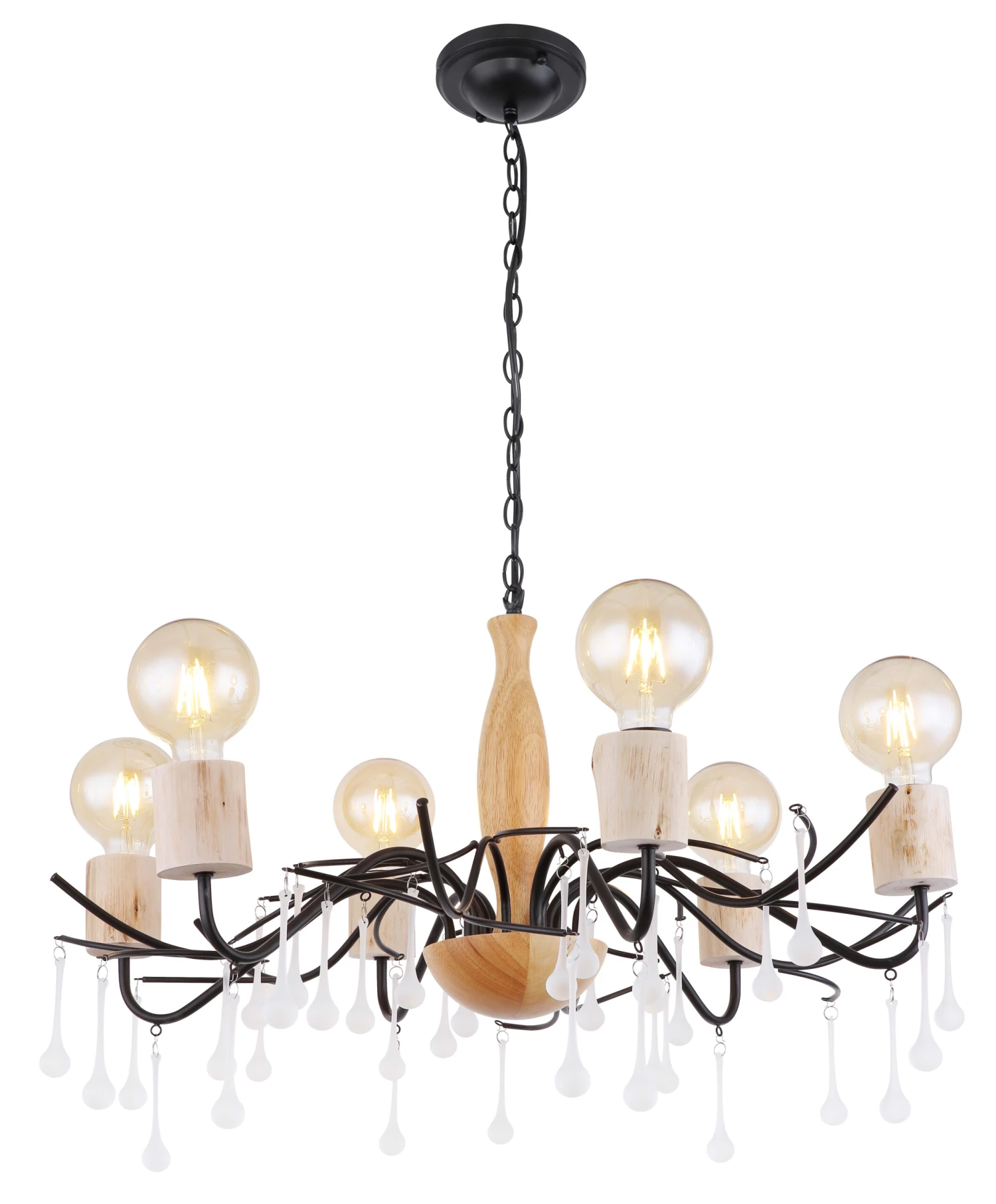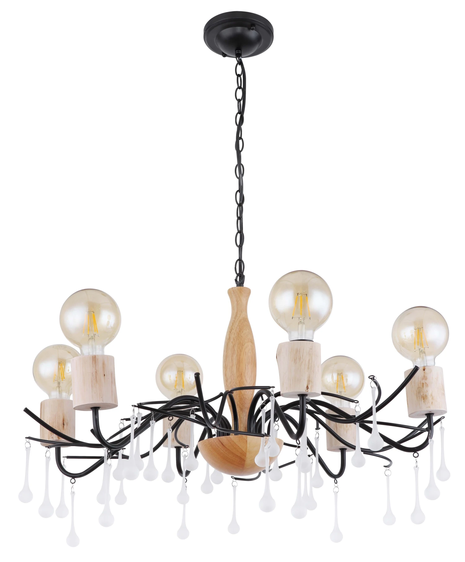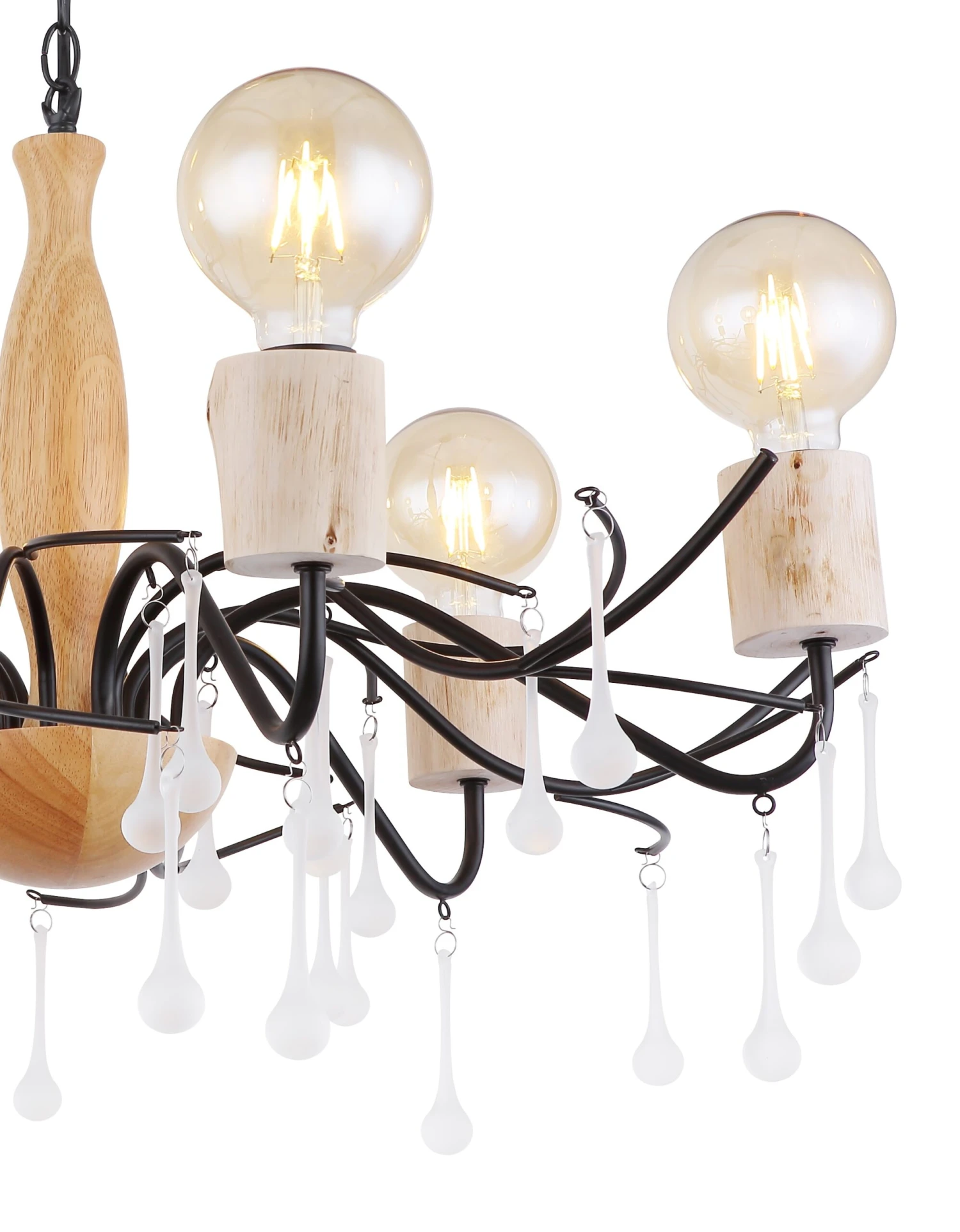 Hängeleuchte Metall schwarz matt, Holz naturfarben, Glasstäbe satiniert, ø: 700mm, H: 1200mm, exkl. 6x E27 60W 230V