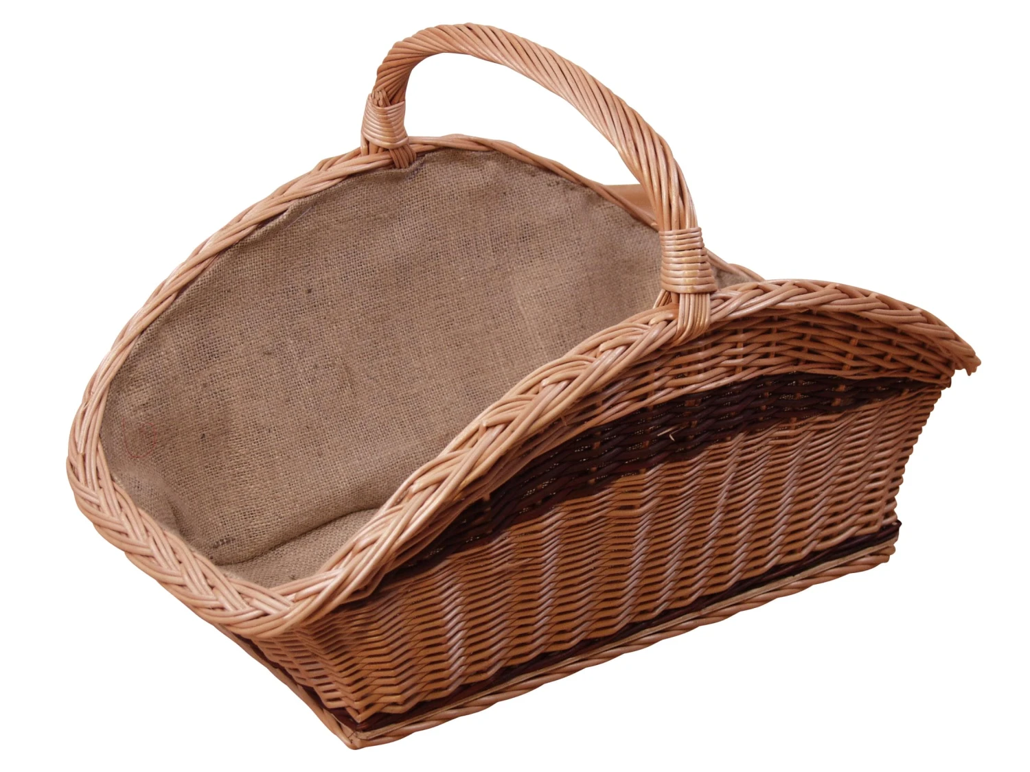 Moderner handgeflochtener Weidenkorb, naturfarben, mit festen Holzboden und praktischen riff. Dekorativ und schön mit dunkelbraun gebeizten Streifen abgesetzt. Innen mit Jutesack ausgestattet.