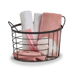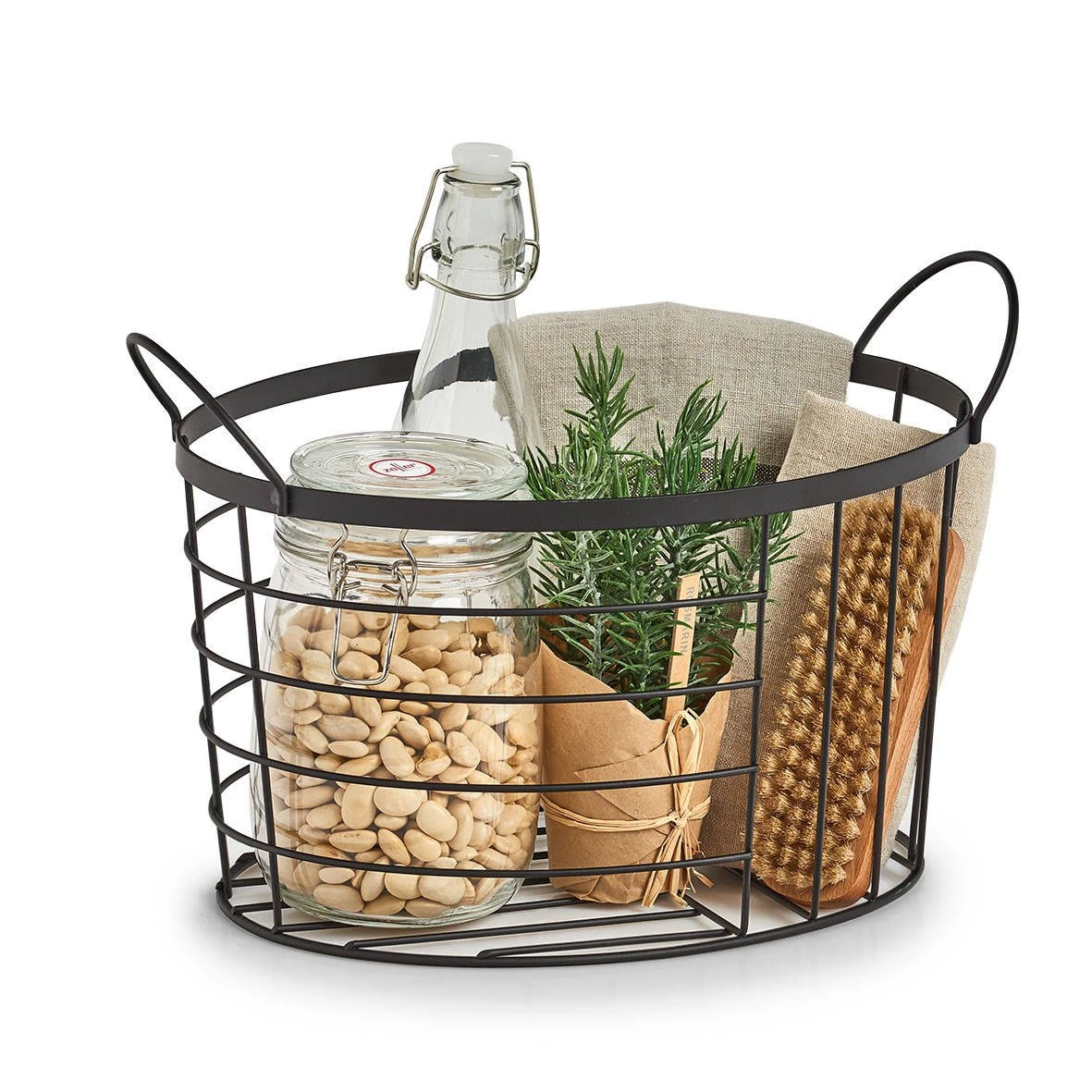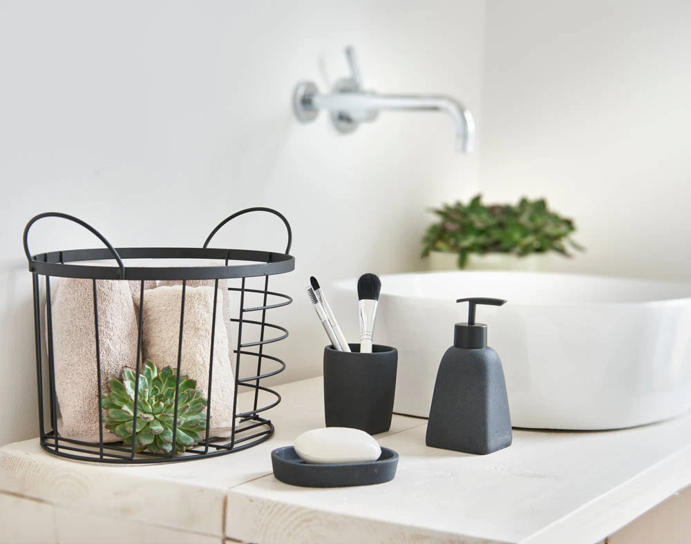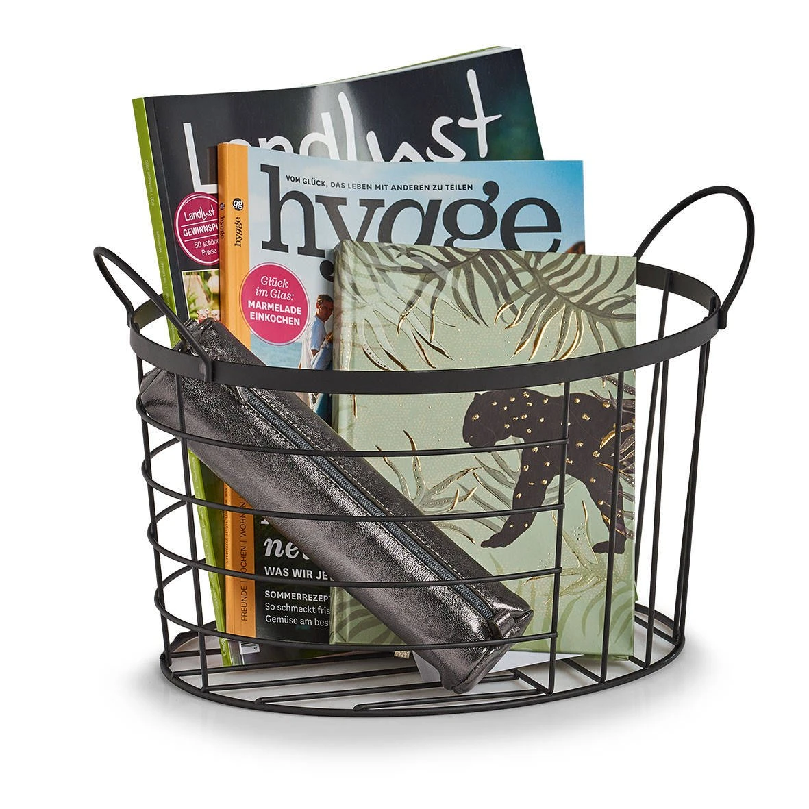 Für die Organisation im Bad oder Flur bieten wir einen Metallkorb der renommierten Marke Zeller an. Der schwarze Drahtkorb in minimalistischer Form ist ein Accessoire, das sich ideal für Innenräume im Loft-Industriestil eignet. Die Kombination aus Metall und Mattschwarz ist ein echter Hit, wenn es um Dekorationen und Wohnaccessoires geht. Der Korb besteht aus lackiertem Metall — ein solider und langlebiger Gegenstand. Sie können es als Organizer für das Badezimmer verwenden und Kosmetika, Zeitschriften oder als Organizer für den Flur verwenden.