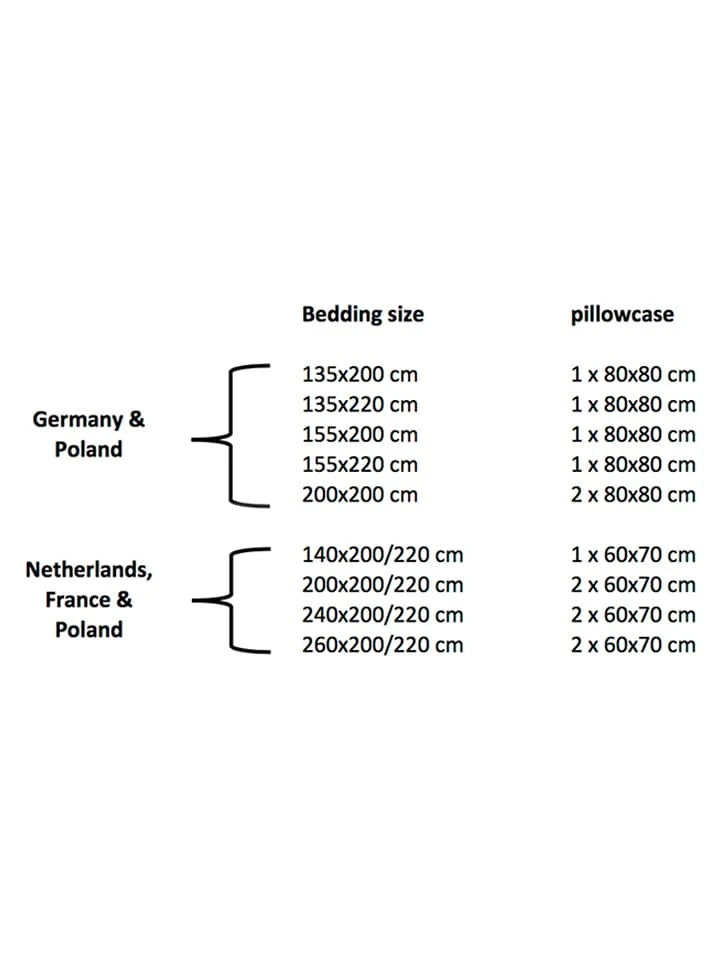 – bei Größe 135 x 200 cm, 155 x 220 cm und 140 x 200 cm: 1 Bettbezug und 1 Kissenbezug