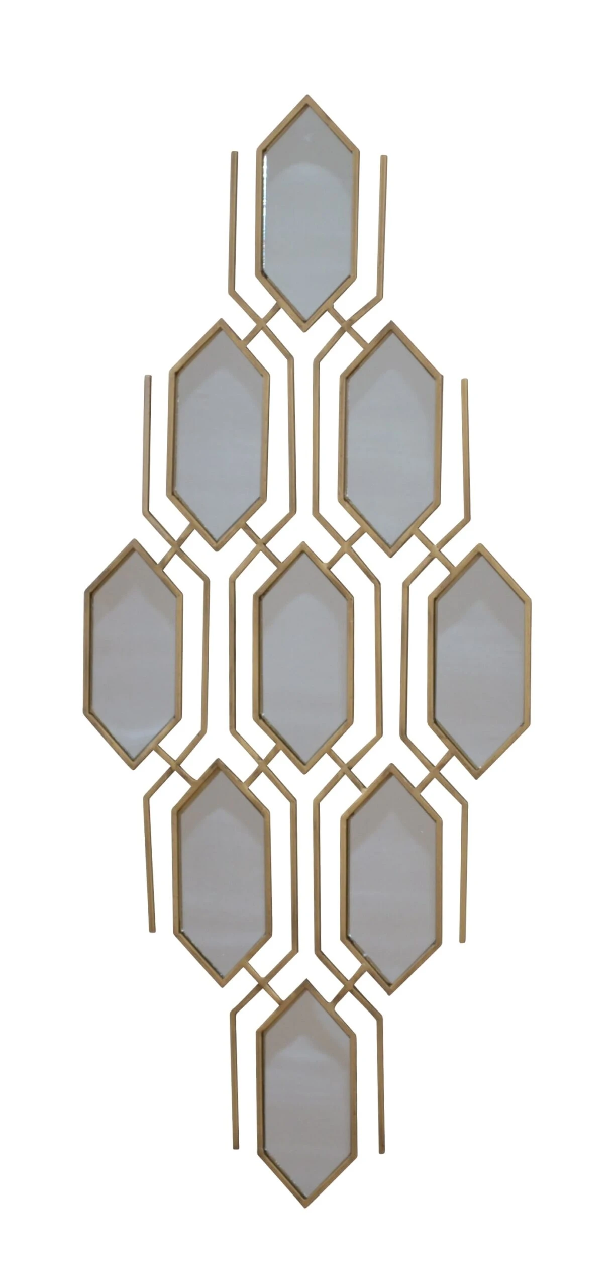 Moderne Wanddekoration aus Metall, antik goldfarben, mit einer modernen Retrofrom, kombiniert mit insgesamt 9 eingelegten Spiegeln. Objekt lässt sich hochkannt oder quer aufhängen.Görße einer Spiegelfläche: ca. 8,5 cm x 20,5 cm. Gesamtmaße: Ca. B. 45 x T. 2 x H. 108 cm. Eine schöne, hochwertige Wanddekoration für den gesamten Wohnbereich.
