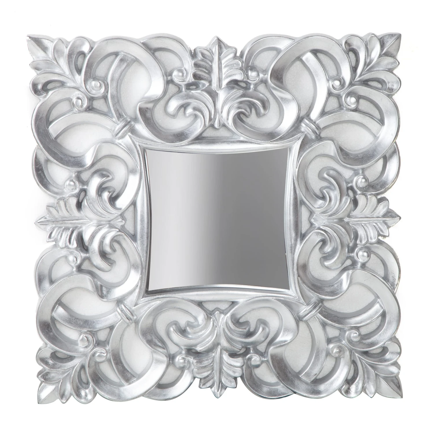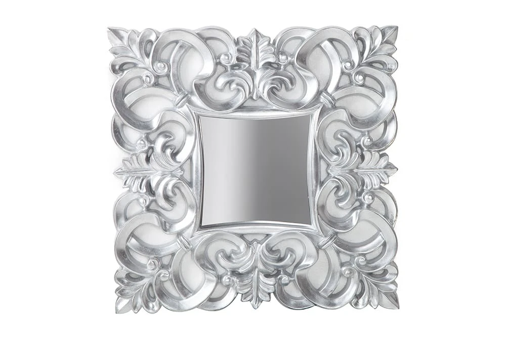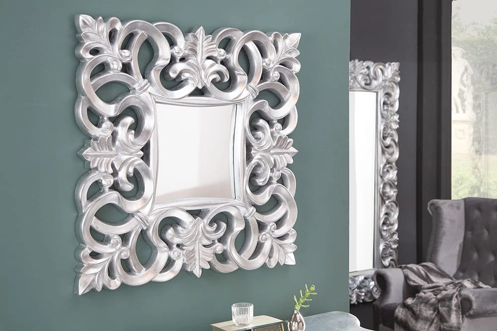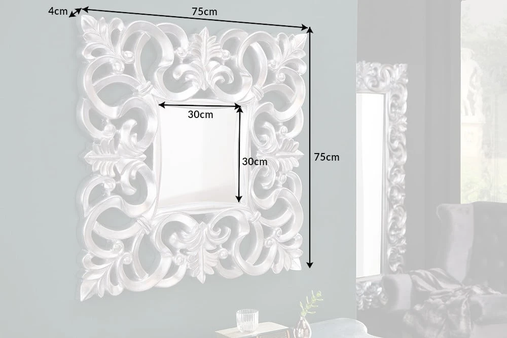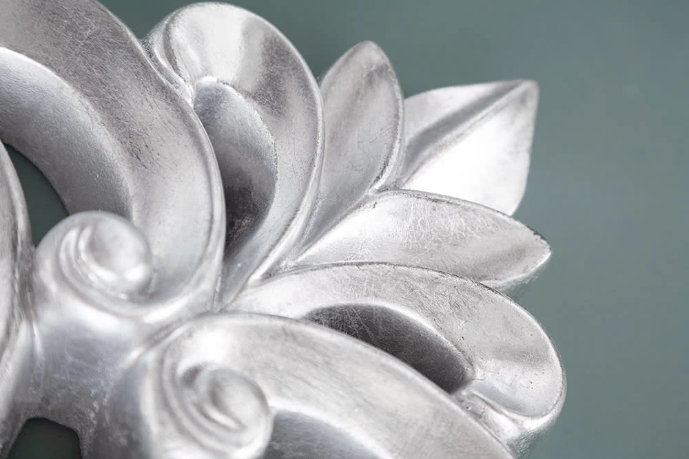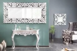 Der imposante Rahmen des Spiegels erinnert durch die silberne Lackierung und die geschwungenen Ornamente an das Design des Barocks – besonders edel und luxuriös eben. Somit wird der auffällige Spiegel zu einem tollen Deko-Objekt, um Ihren Wände das gewisse Etwas zu verleihen.
